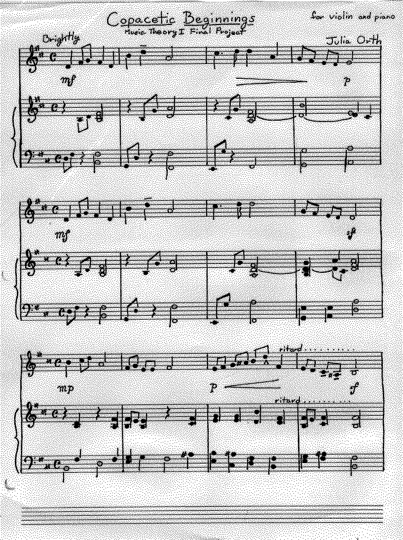 When I was young I had seven years of piano lessons. I can read music for piano, and play written music quite well, but didn't have even basic music theory to go with it until I took Music Theory I and II at New College. It was a fantastic course, starting with chant, moving from hexachords through modes, through major and minor scales, tuning systems, then into rhythm and harmony. Music Theory II starts where I leaves off, right where tonality has been established and starts to break down -- secondary chords, pivot-chord modulation to closely related keys, augmented sixths, modulation to remotely related keys, and all the way down to atonality. I feel like I have a really good grasp of the theoretical materials, both abstractly and in terms of analyzing music. My aural skills -- harmonic and melodic dictation--have naturally lagged behind, but are certainly present.