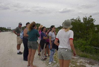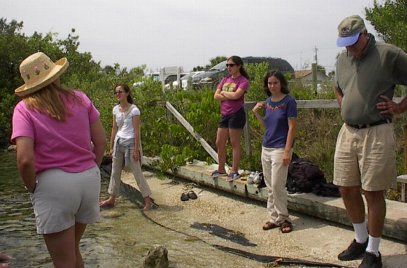 The class comes down to where Debi & Petra did their two years of shore observations. They must be dedicated--it's only been a few minutes and I for one already want a cushion. Second person from the right is Debi. Albee Road Bridge can be seen in the background.